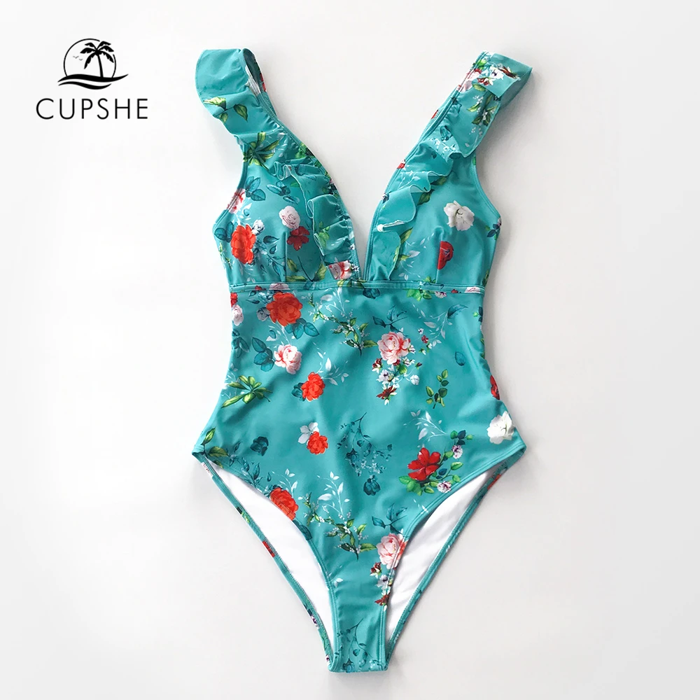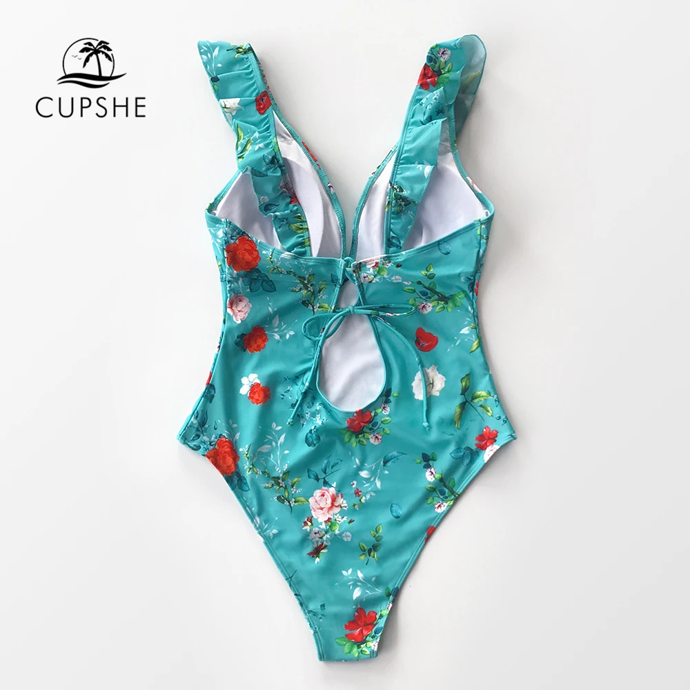 Best Quality CUPSHE Teal Floral Ruffled V-Neck One-Piece Swimsuit Sexy Lace Up Padded Women Monokini 2019 Girl B