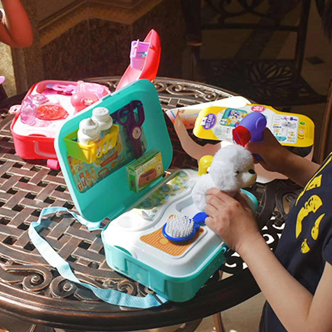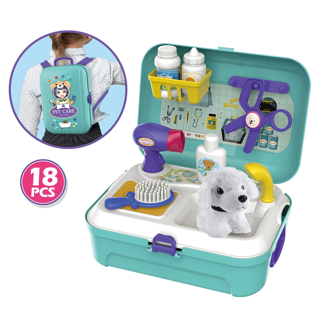 Hot Sale 14Pcs Children Pretend Play House Wash Suit Puppy Backpack Case Toy Pet Wash Backpack Play